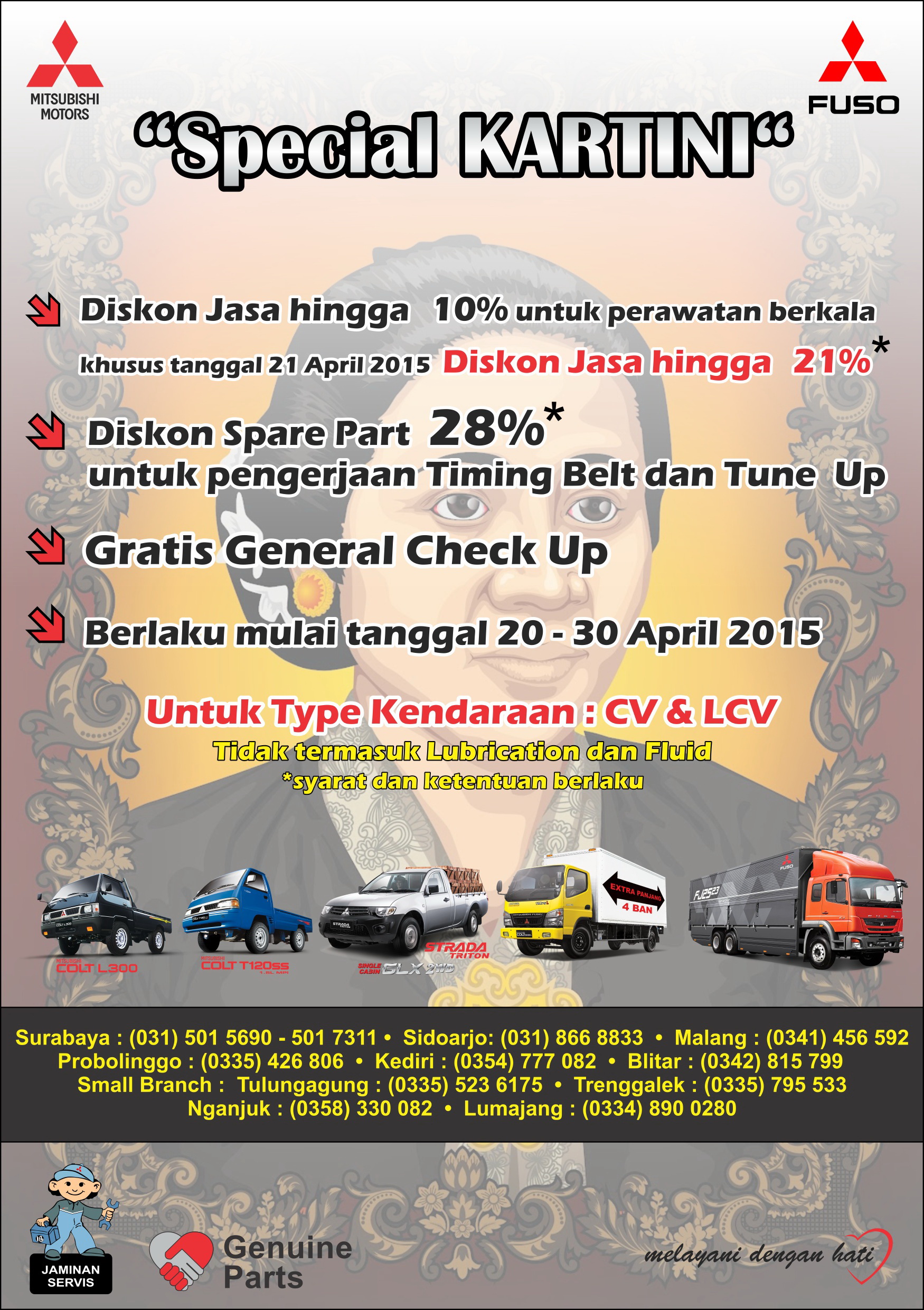 Khusus kendaraan niaga (Colt L300,Colt T120SS,Strada Triton Single Cabin,Fe series dan Fuso) Dapatkan diskon jasa perawatan berkala hingga 21 % (khusus service tanggal 21 april 2015) dan dapat kan juga diskon spare part original 28 % untuk jenis pekerjaan Timing Belt dan Tune Up, Serta nikmati juga Gratis General Check Up 15 Item.