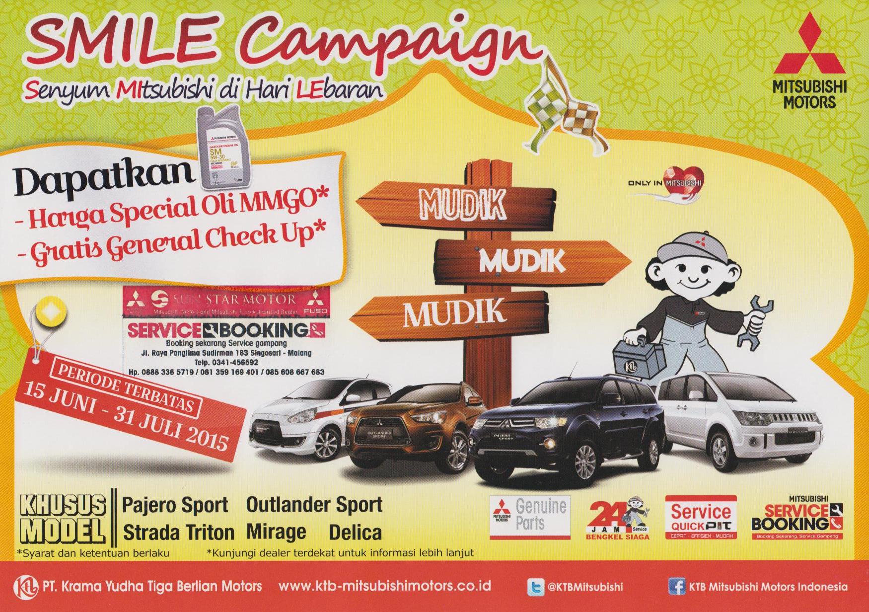 Smile Campaign 2015 untuk customer setia Mitsubishi khusus kendaraan passenger yang melakukan service di periode 15 Juni 2015 s/d 31 Juli 2015,dapat menikmati: