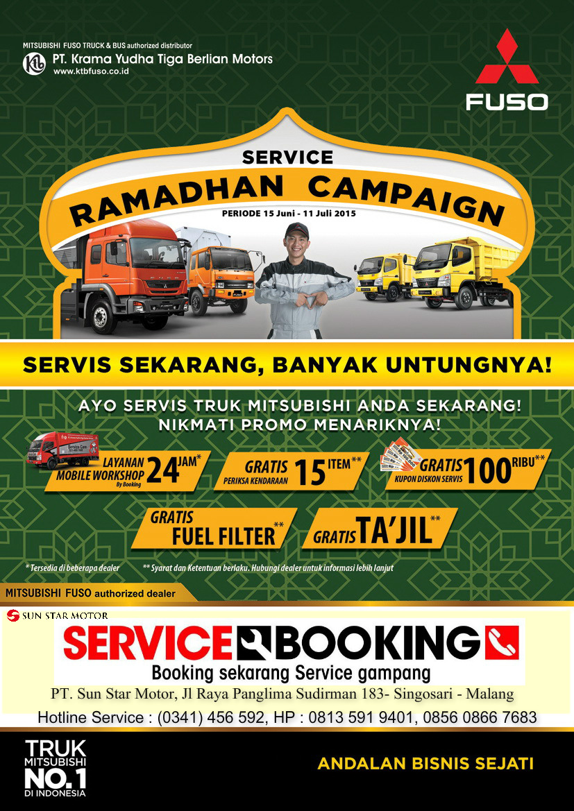 Khusus untuk kendaraan Mitsubishi FE series & Fuso yang melakukan serviceย Perawatan Rutin Berkala,General Repair,Engine Tune Up,All Brake dan Clutch OH di periode 15 Juni s/d 11 Juli 2015 berhak mendapatkan:
