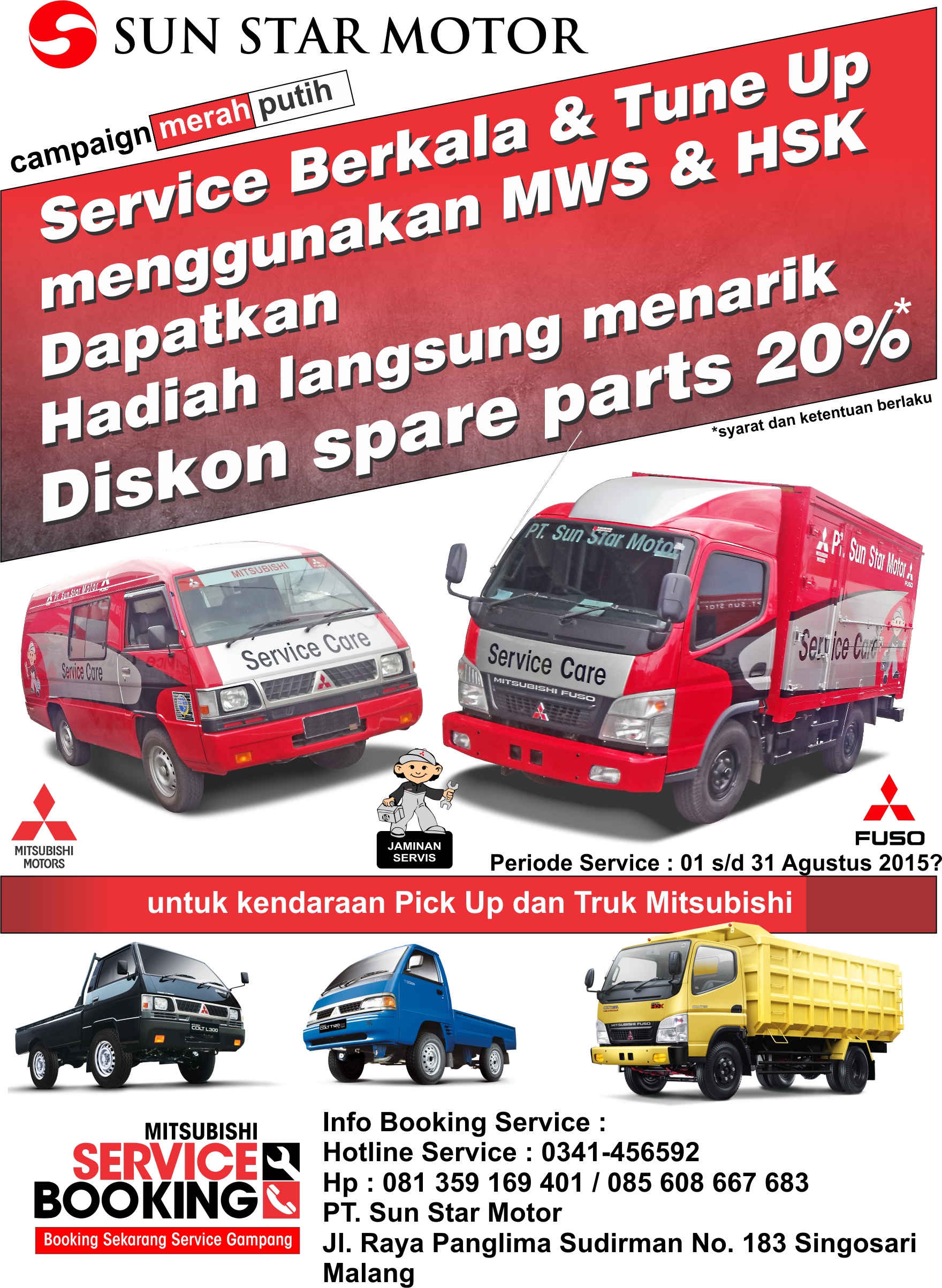 Demi meningkatkan pelayanan purna jual yang prima PT. SUN STAR MOTOR MALANG mengadakan Service Berkala & Tune Up via MWS atau HSK berhak mendapatkan hadiah Special Langsung + Discount Spare Part 20%.