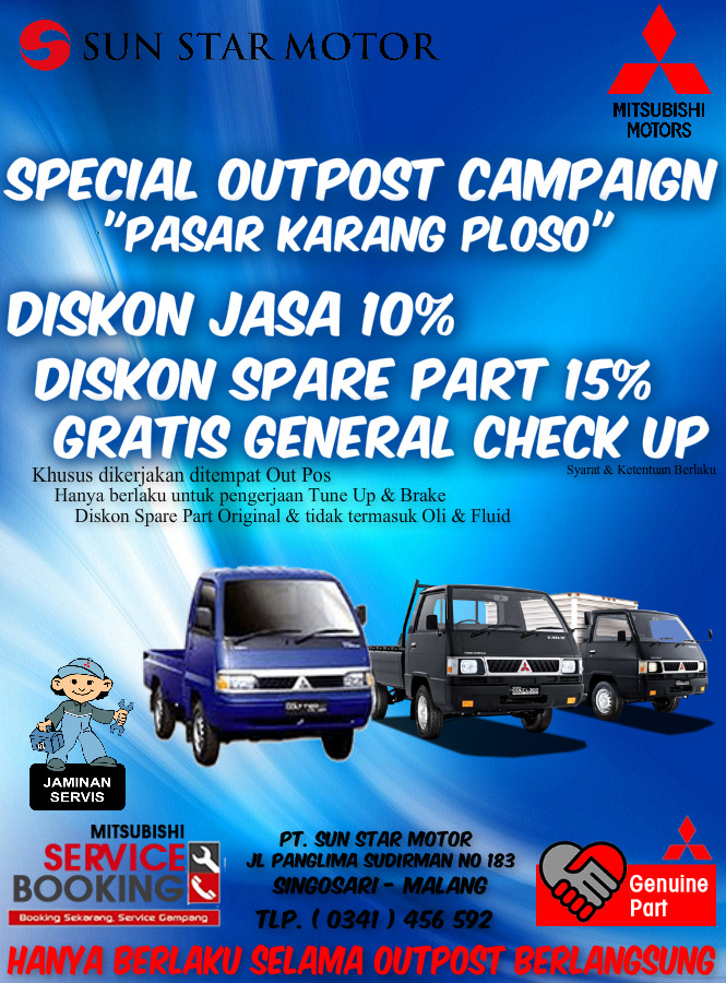 Dalam rangka meningkatkan pelayanan Kami Service Dept PT. Sun Star Motor Malangย mengadakan Out Post di Pasar Karang Ploso. Khusus untuk Kendaraan Mitsubishi Colt L300 & Colt T120ss yang melakukan Tune Up & Perbaikan Rem berhak mendapatkan Diskon Jasa sebesar 10% & Diskon Spare Part Original sebesar 15 % . Untuk Diskon tidak termasuk Oli & Fluid. Periode Out Pos 23 Februari – 5 Maretย 2016. Buruan datang & service kendaraan Anda……