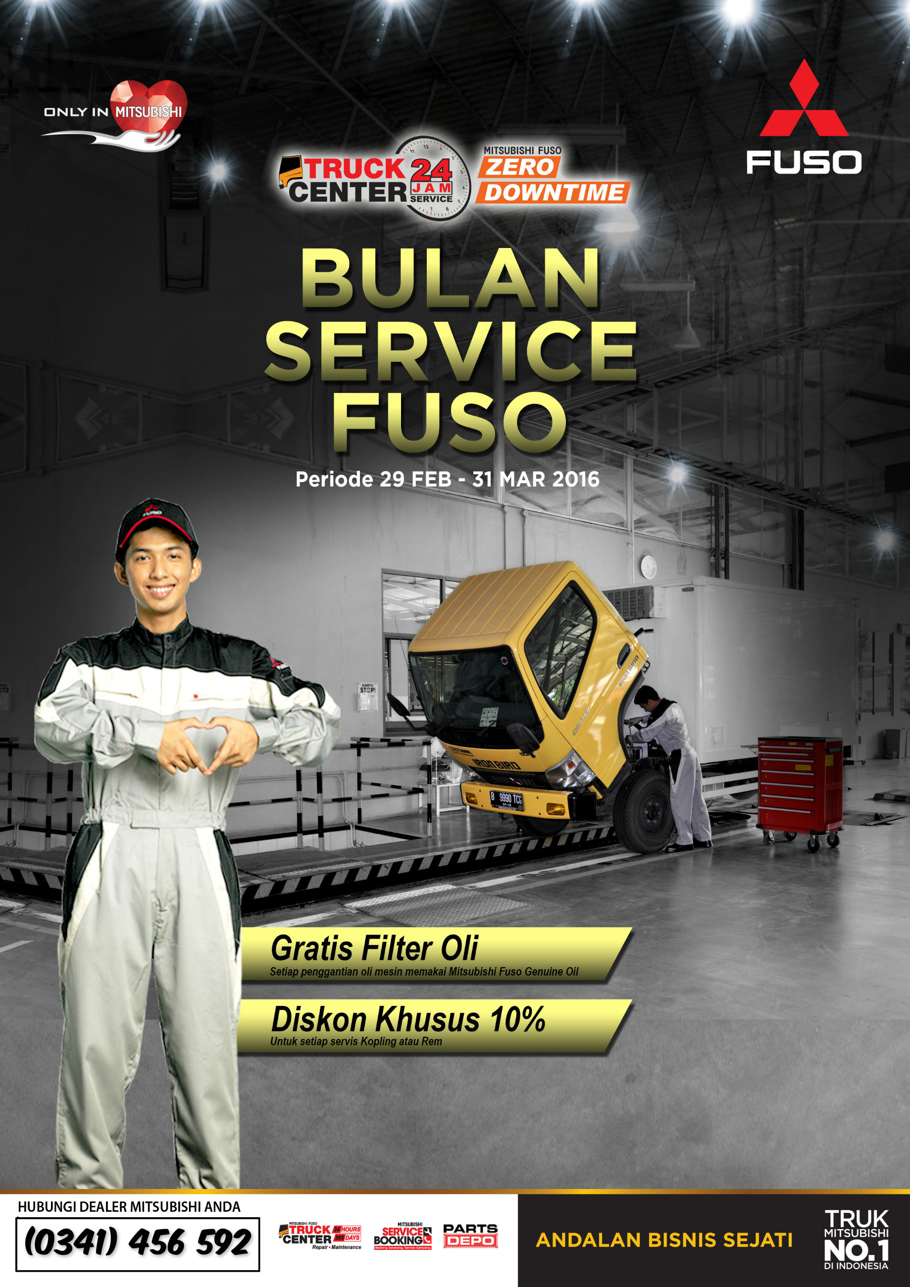 Special bagi Anda pengguna setia Kendaraan Niaga Mitsubishi ( FE Series & FUSO ) dibulan ini Kami memberikan GRATIS FILTER OLI bagi Anda yang melakukan penggantian oli menggunakan MFGO, dan DISKON JASA SEBESAR 10% bagi Anda yang melakukan pekerjaan / perbaikan Clutch dan/atau Brake. Promo iniย berlaku selama periode service 29 Februari – 31 Maret 2016.