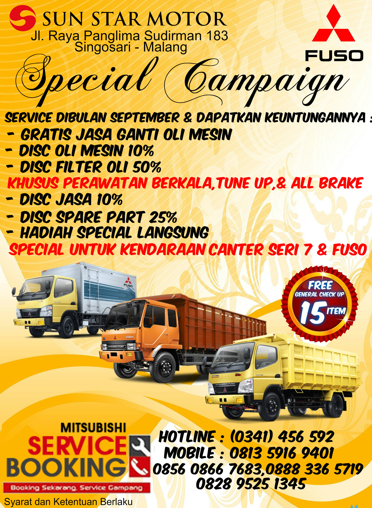 TUNGGU APALAGI,BURUAN SERVICE KENDARAAN COLT DIESEL & FUSO ANDA….. HANYA DI PT. SUN STAR MOTOR – SINGOSARI JL. RAYA PANGLIMA SUDIRMAN 183 HOTLINE SERVICE : (0341) 456592 MOBILE: 081 359 169 401 , 085 608 667 683