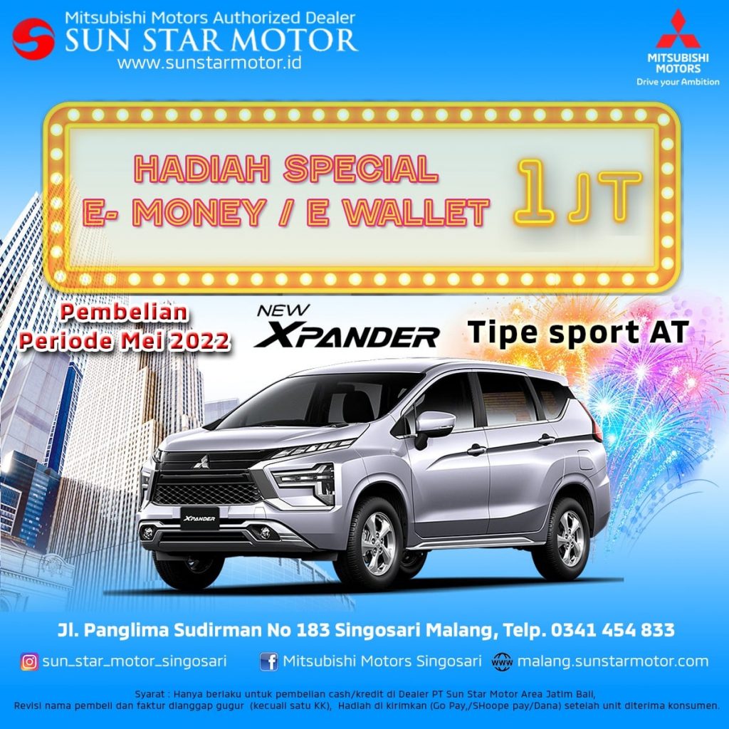 Dapatkan penawaran menarik setiap pembelian New Xpander 2022 tipe Sport Automatic khusus di bulan Mei 2022 berupa uang elektronik (E-Money/E-wallet) senilai 1 juta rupiah.