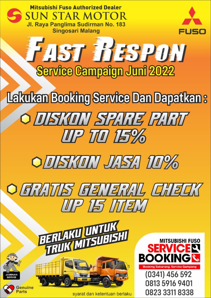 Dalam rangka ikut membantu mempercepat pemulihan perekonomian Indonesia, Kami Service Dept. PT. Sun Star Motor Malang mengadakan campaign Fast Respon.adapun hanya dengan melakukan Booking Service min 1 hari sebelumnya Anda berhak mendapatkan